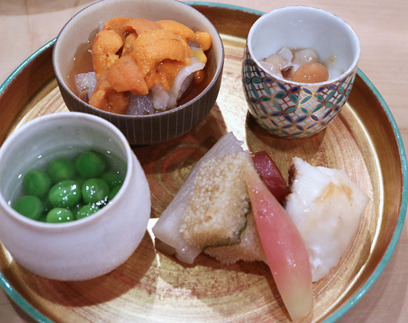 ●八寸。うすいえんどう豆ひすい煮/うに、その下に魚介いろいろ(たいら貝、みる貝、いか、さより、とり貝)と、うど/蛸/鯛の塩焼き、からすみ、白ずいき、子持ち昆布、みょうが