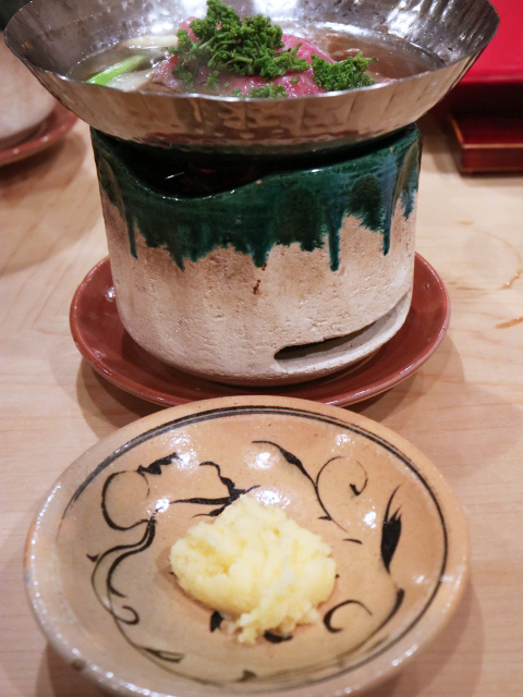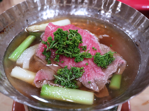 ●花山椒と牛肉の鍋仕立て、白と緑のアスパラガス。これはおだしまで全飲みしました。脂身も少ない牛肉非常に美味でした。