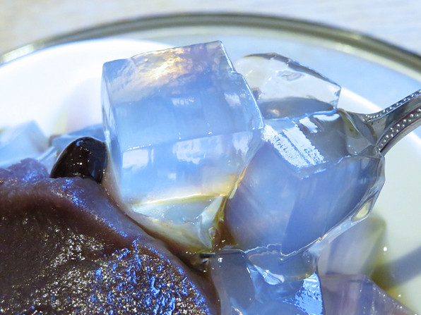 ●「月ヶ瀬」さんのあんみつの、ふるふるの寒天。水分量多くて、早く食べないとじゅわーと水が出てきます。