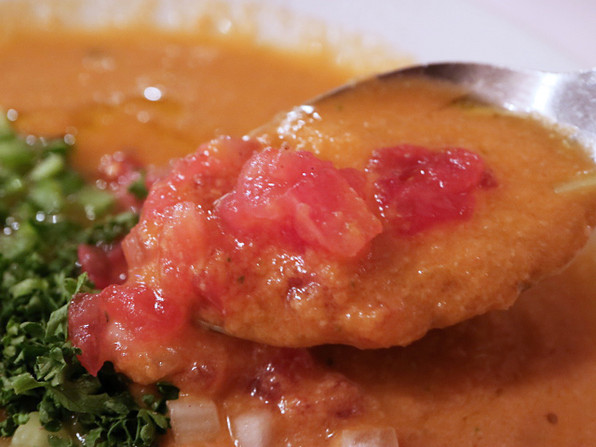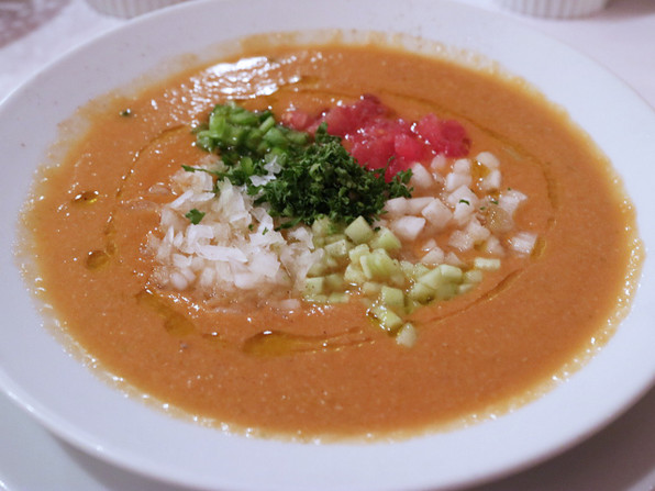 ●スープが夏仕様のガスパチョになっていました。さわやーか、同時に旨みもたっぷりで、刻んだ野菜の食感も楽しい前菜の品です。