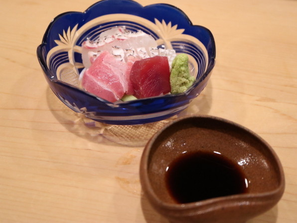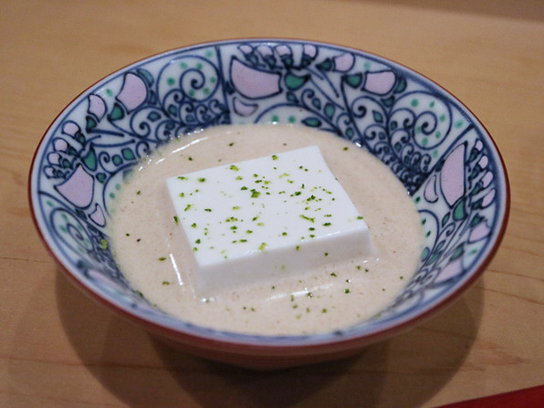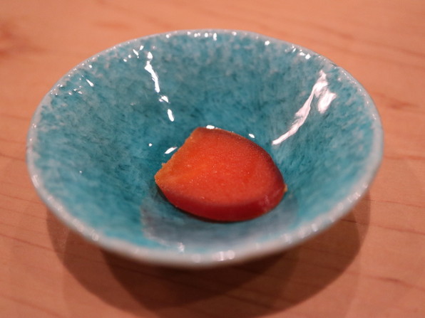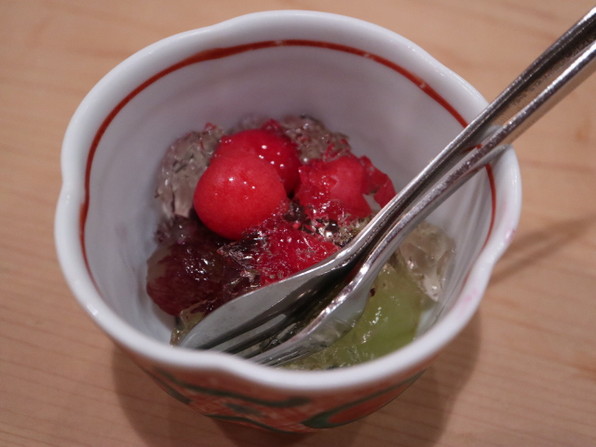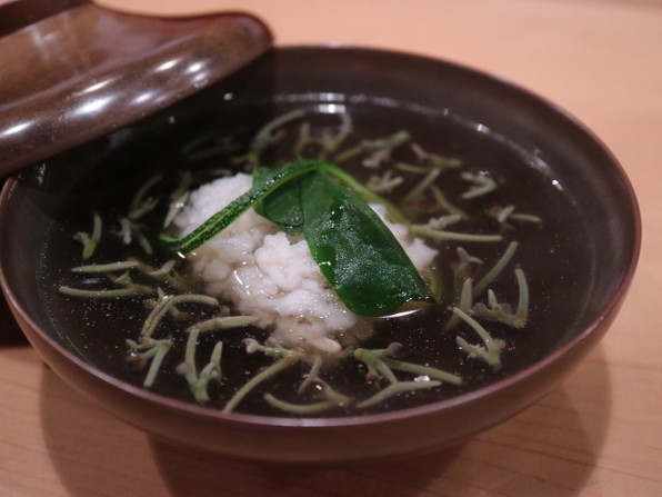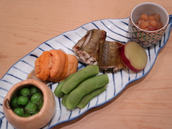 うすい豆(ジュレ寄せ)/枝豆/うに(下にずいき)/鮎/丸十/鯛の昆布締め(本来は蛸)