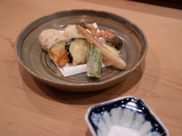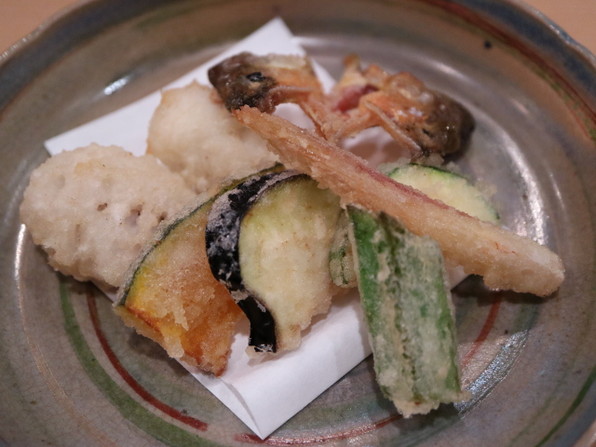 ●天ぷらは、鮎の頭、鱧、ズッキーニ、なす、かぼちゃ、酢漬けのみょうが、おくら。