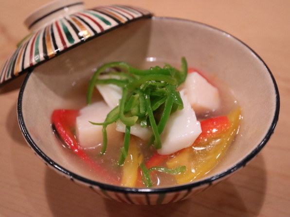 ●焚き合わせ。帆立、紋甲いか、パプリカ、万願寺唐辛子、冬瓜、鶏スープのあんかけ。