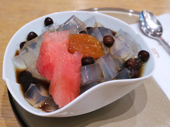 ふるふるの寒天とつぶつぶの赤えんどうの食感のコントラストを楽しみます。そこに黒蜜がとろりんとからんで、ほんと理想的な甘味天国と思います。夏仕様で、フルーツはすいかが添えられてきました。あんずの酸味も絶妙に効いて、幸せでした。感涙。(T_T)(T_T)