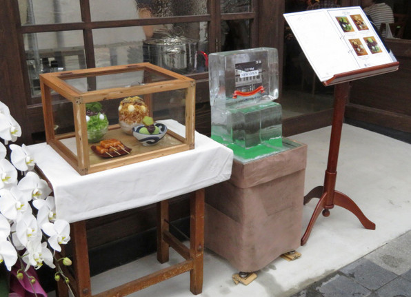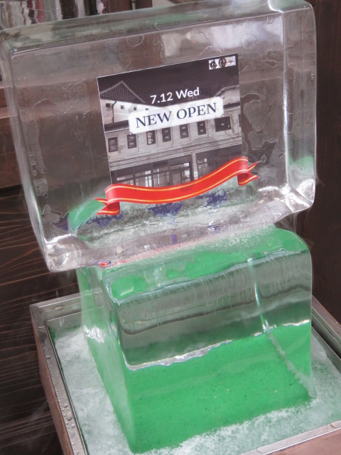●お祝いのメッセージが仕込まれた氷柱。目にも涼しいすてきなプレゼントは、氷やさんからのものということです。
