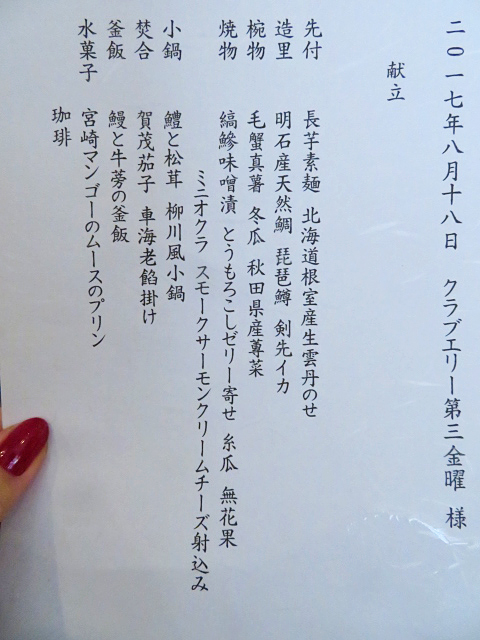 8月18日クラブエリー第3金曜で、「祇園 にし」さんにお世話になりました。「日本料理 とくを」さんなどで修業された西隼平さんのお店、創業1年とひと月少しで今や非常に人気のお店です。季節の美味尽くしにしてくださって、おかげでわんわん盛り上がりました。よかったー\(^o^)/\(^o^)/