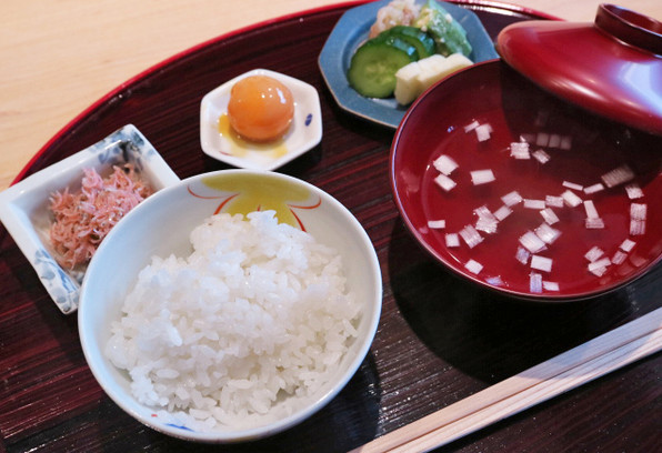 ●梅風味ちりめん山椒、卵黄醤油漬け、香の物と、御飯のお供がまた充実、つやつやの白ご飯を際限なく食べたくなります。