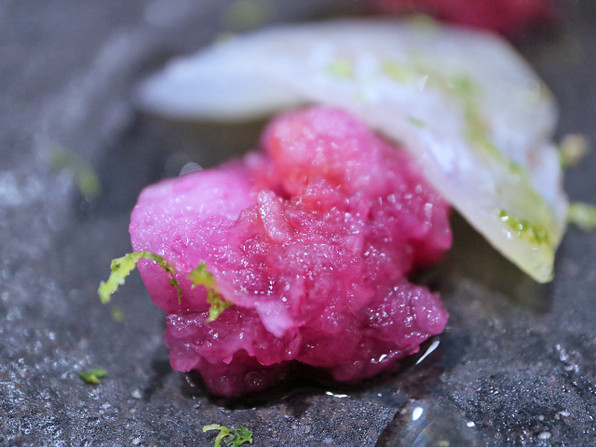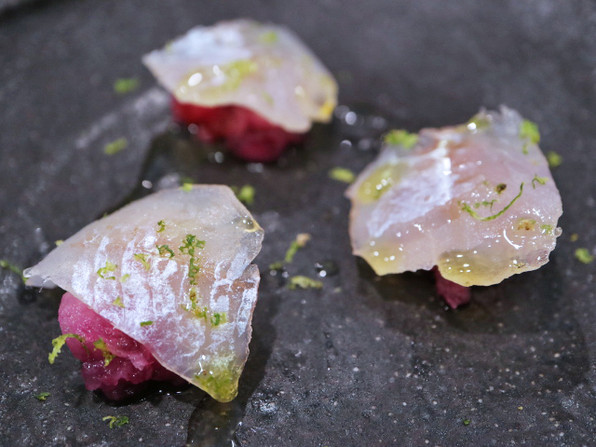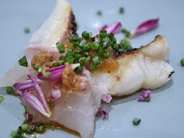 ●ひげそり鯛を、カルパッチョと炙りで。鯛と思えぬ食感と風味。すずきに近いと思う。旨。
