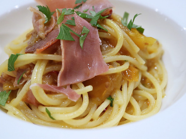 アーリオオーリオに、パルマの生ハム、黄トマト。