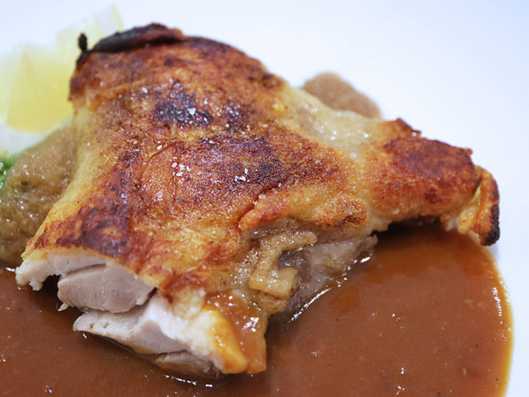 ●丹波地鶏のコンフィ、デミグラスソースと。添えてあるのは河北農園の万願寺とうがらしにりんご醤油。旨旨旨(*_*)(*_*)