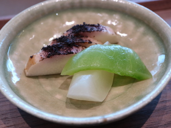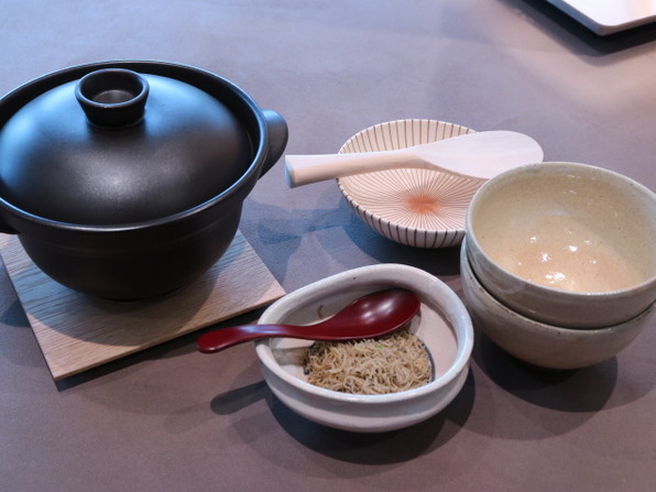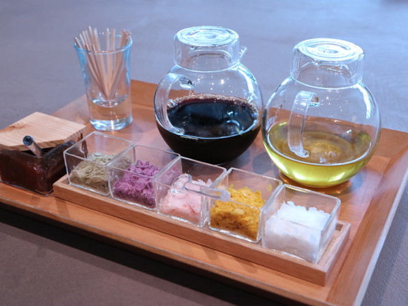 ●味は薄めですから調味どうぞと、山椒オイルやもろみ味噌、五色の塩などが供されます。
