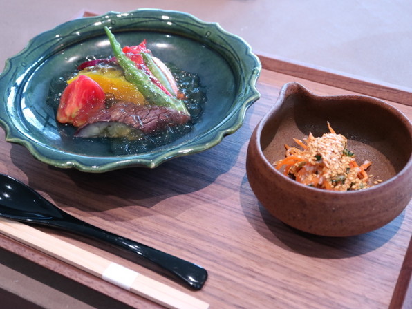 ●京丹後の野菜いろいろたっぷりにジュレをかけたお皿に、和えもの。