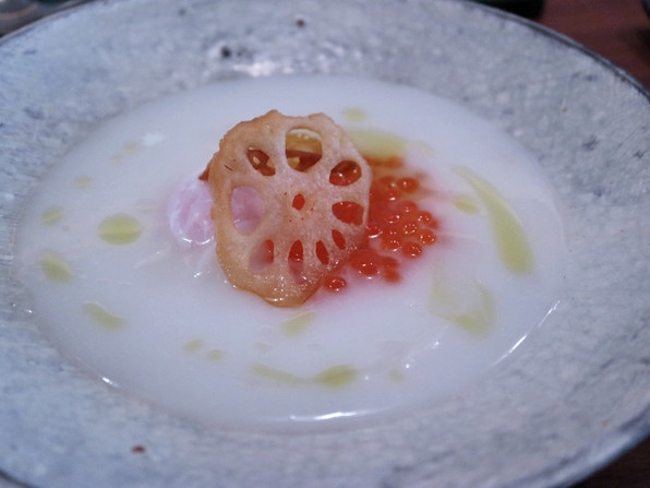 ●お米のスープ 温泉卵、蓮根のピクルス、自家製いくら
