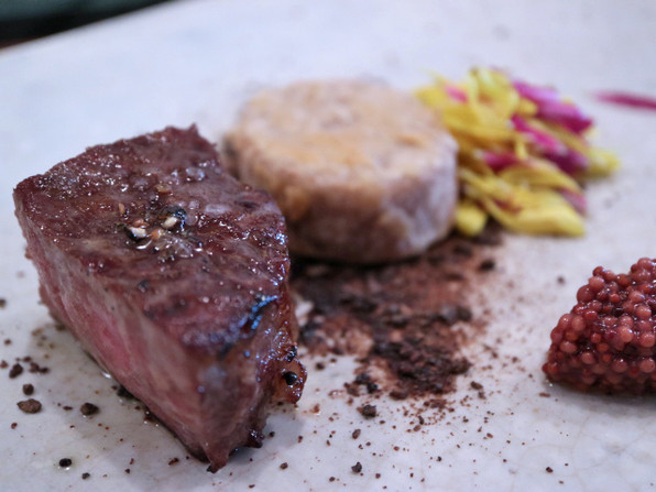 ●蓼科牛ロース肉の炭火焼き 二子芋 菊芋 タスマニアマスタード