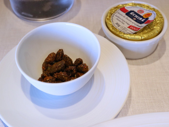 ●さて、軽やかなデジュネです。アミューズにピスターシュのロースト(カラメリゼ)が供されたのち、