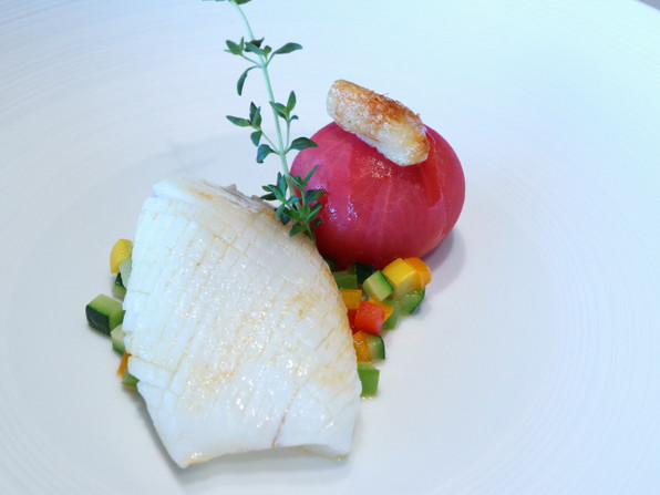 ●新烏賊、プティレギューム(いかの下に敷いてある4種のプロヴァンス野菜)、フルーツトマト。トマトの上にはにんにくのロティ。