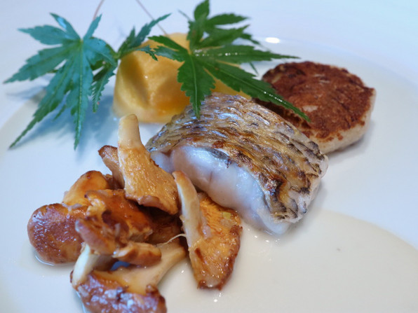 ●魚料理はのどぐろ、ソースはヴァンジョーヌ。ガルニチュールにジロール、毛蟹と銀杏芋のガレット。奥にフルーツの柿。