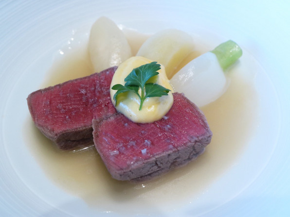 ●肉料理は鳩か牛肉の選択で、わたしは鳩はあまり好きではないので牛肉を選択。京都のひめ牛フィレ肉、上のソースはベアルネーズ。牛肉のだしと。