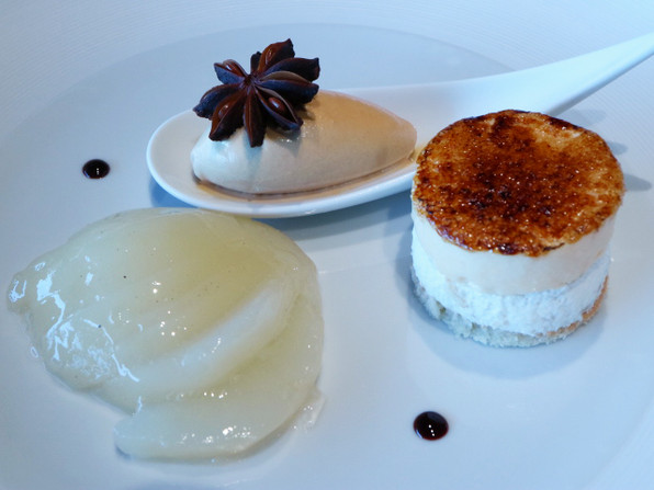 ●デセールは梨のコンポートに、シチリアのヘーゼルナッツが香るシブースト、カラメルのアイスクリーム。上にスターアニス。