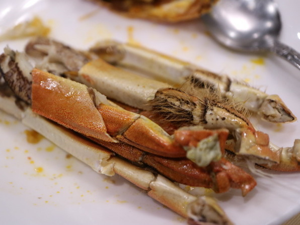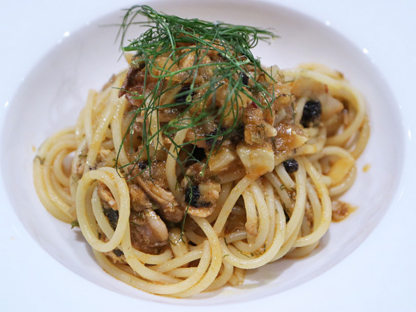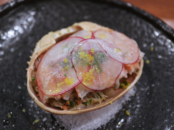 ●甲羅の中には、ルッコラとオリーヴオイルとレモン汁で和えた蟹の身がみっちりと。