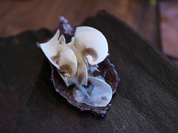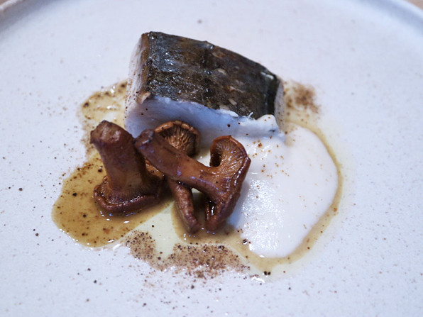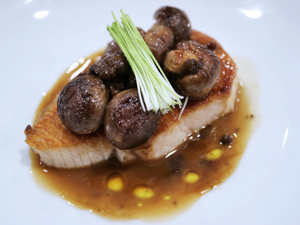 ●ぶりのロースト、上に「ちいたけ」、芽ねぎ。山椒醤油ソース。