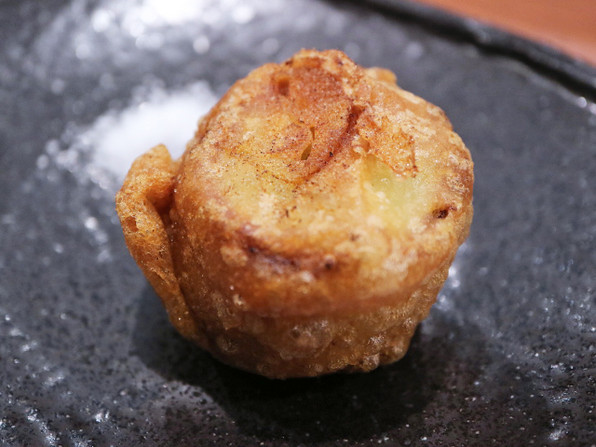 ●びっくりするほど太くて大きなポワロー、北海道の「真狩リーキ」の天ぷら ゆこう(柑橘)と。これが泣けるおいしさでした。