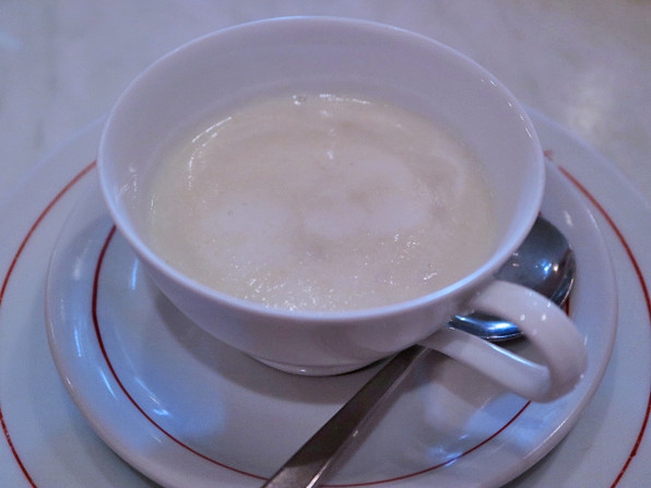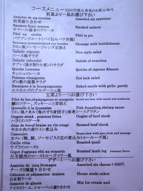 スープ、前菜と主菜にデセール、食後の飲み物もついて3500円ちょうど(二条通寺町の「ブション」さんなみ!)というコースを始められたとのことで、さらにそれがアイドルタイムなしで終日注文可能ということで大喜びです。