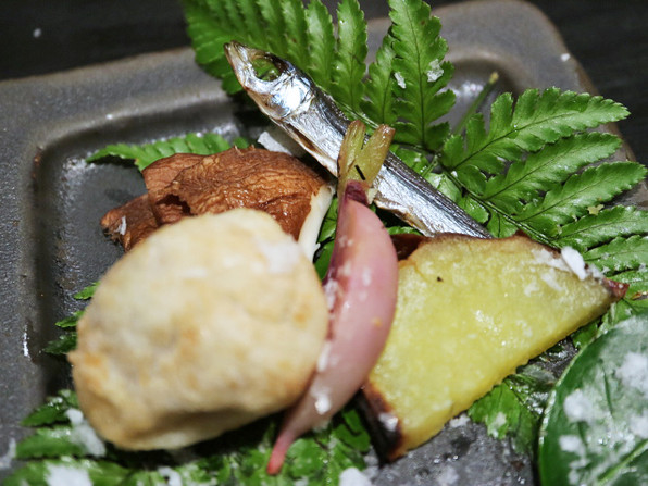 ●さつまいも、大根、椎茸、マッシュした里芋をまとめて揚げたもの、めざし。