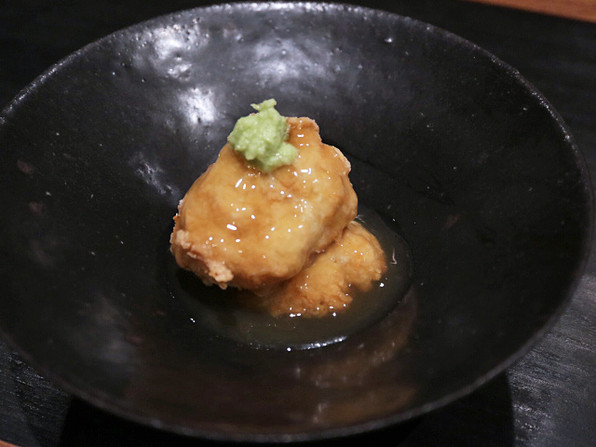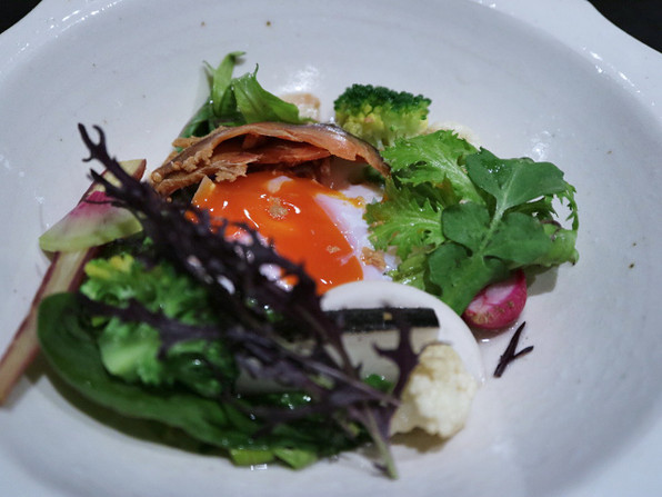 ●温泉卵が仕込まれています。濃厚な卵、山田農園さんのものです。ものすごく風味強いです。へしこが塩気と香味を添えています。