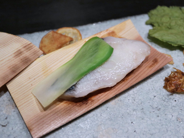 ●さわらの杉板焼き。パリパリの葉は、大根の葉で、香ばしくて甘みがありました。