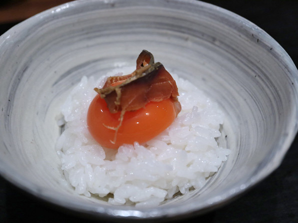 ●これはわたしがいただいたのではなくて、召し上がった方のものを撮らせていただきました。卵かけご飯の、夜スペ=夜のスペシャル版。へしこが添えられるのでした。