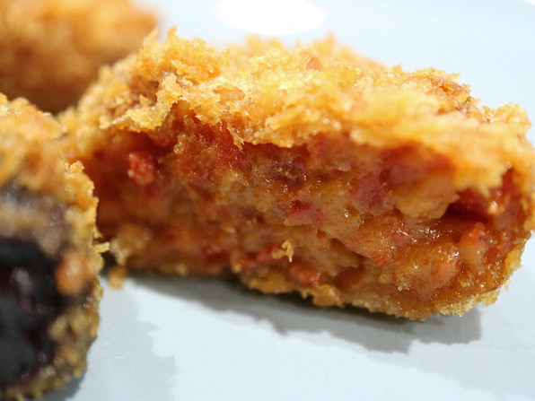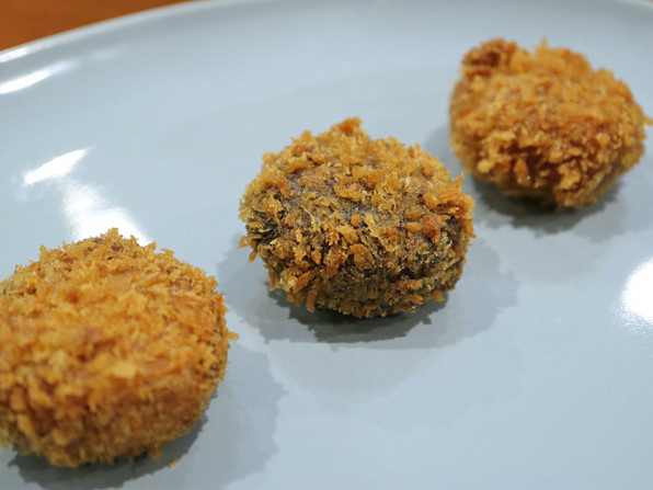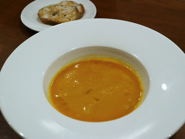 ■ ガスパチョに、エスカルゴをシャンピニョンに詰めたもの。エスカルゴバターと、添えられたパンがあまりにもおいしくて山盛り食べてしまって前菜2つでお腹いっぱいいっぱいいっぱいに。