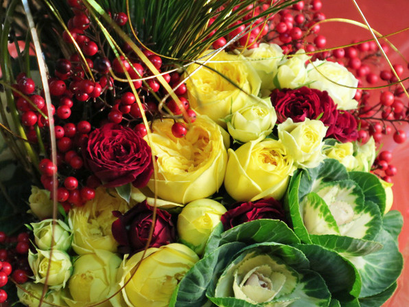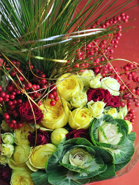 ■ 毎年「プーゼ」みなちゃん=浦沢美奈さんに作ってもらうお正月アレンジメントです。今年は黄色×赤にしてもらいました。