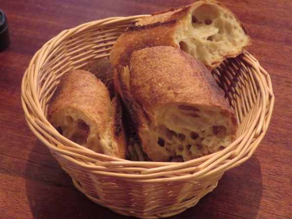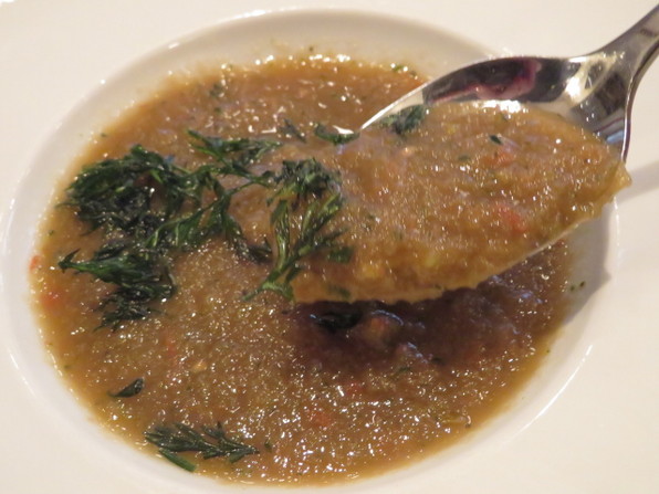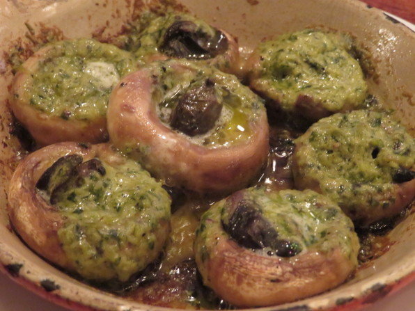 ■ ガスパチョに、エスカルゴをシャンピニョンに詰めたもの。エスカルゴバターと、添えられたパンがあまりにもおいしくて山盛り食べてしまって前菜2つでお腹いっぱいいっぱいいっぱいに。