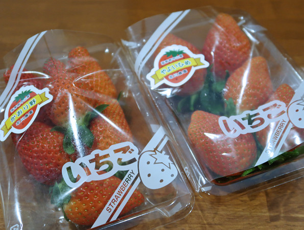 ●こんないちごでした。滋賀県守山市の北川農園さん「かおり野」「やよいひめ」。大粒でしっかり噛みごたえがあっておいしい。