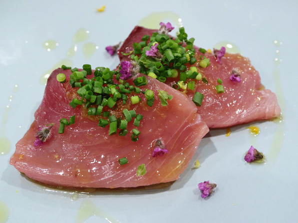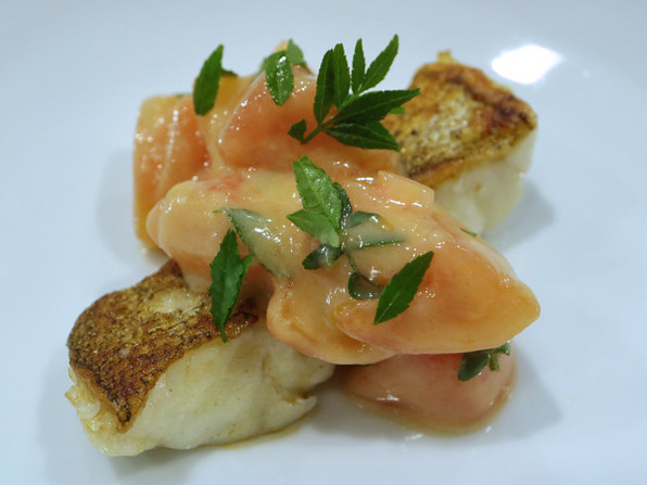 ●焼魚はおおもんはた、上にトマト白味噌ソース、木の芽
