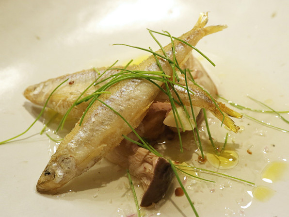 ●前菜その1、揚げたて! 琵琶湖 わかさぎ 岡山 エリンギのマリネ
