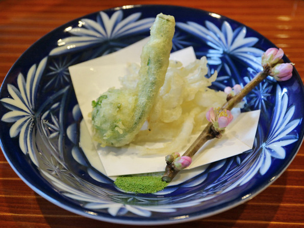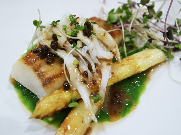 ●青森県の天然平目とホワイトアスパラガス、上にさっと茹でた白魚、実山椒風味。下に菊菜のソース。
