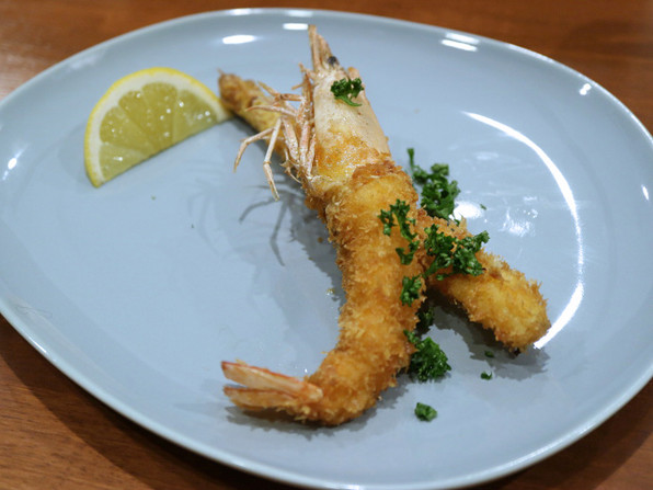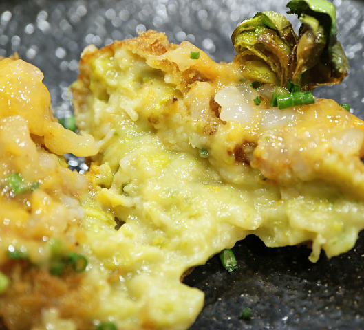 ●甘海老と芽キャベツのクリームコロッケ、上にも芽キャベツ、雲丹と甘海老和えたものをソース代わりに。