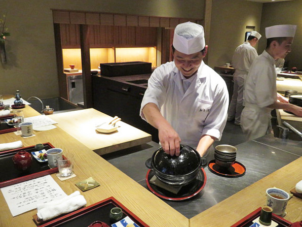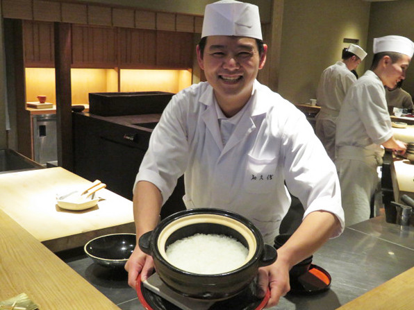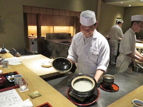 ●ポストやっちゃん(=「丹」の北嶋靖憲さん)ともいう山手陽介さんがにこにこで和久傳米をよそってくれました。明るいわー\(^o^)/\(^o^)/