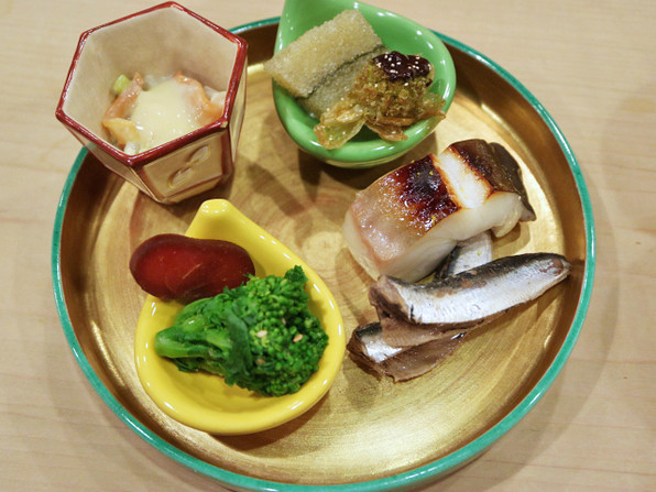 ●春らしい八寸です。上のひちぎり形の器から時計回りに、子持ち昆布とふきのとうの揚げたの、上に味噌/まながつお幽庵焼き/いわし/黄色いひちぎりに菜の花胡麻和え、からすみ/ぼんぼり形の器に、てっぱい(赤貝、わけぎ、紋甲いか、薄揚げ)。