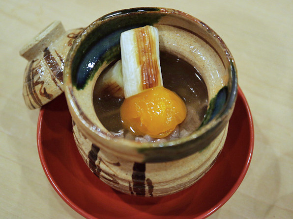 ●熱々すっぽんスープです。中に、焼きねぎ、鶏卵の卵黄、牛肉、そして・・・