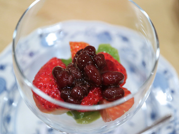 ●食後はいちごに炊いた小豆。下に敷いてあるのは抹茶のムースでした。
