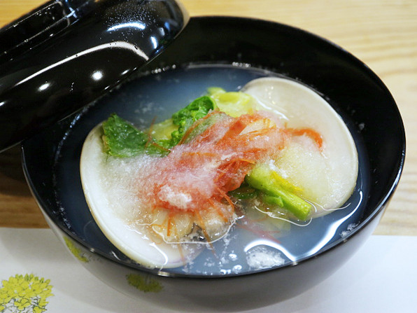 はまぐりのおいしさに柔らかで甘い春キャベツが見事な調和でした。赤いのは糸のように細い金時にんじん。吸い地はかぶらのすり流しです。もうもうこのお椀のためだけでもこのコースいただいてよかったと思いました。ちなみにはまぐりは千葉産ということでした。