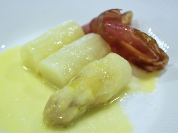 ●フランスの白アスパラガスの茹でたて、バターソース。クラテッロ(生ハム)と。うっとりおいし☆☆☆