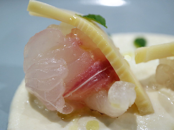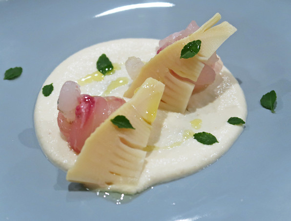 ●天然真鯛、ガス海老、筍ピュレと、木の芽