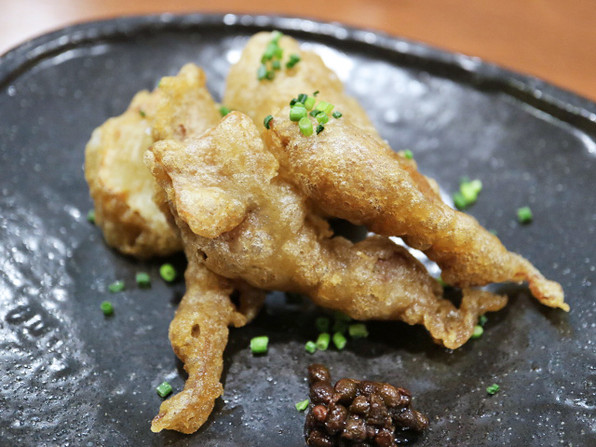 ●筍とほたるいかのフリット。この衣がほんとーーにおいしいわ。もちろん中身も。醤油風味の山椒も添えられました。