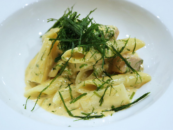 ●NP100=のろっちのパスタ100、その41は、本ますと筍のクリームソースがからみ、 八代の海苔が香り立つペンネでした。