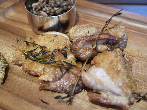 ●京赤地鶏ハーブマリネ焼き、レンズ豆と