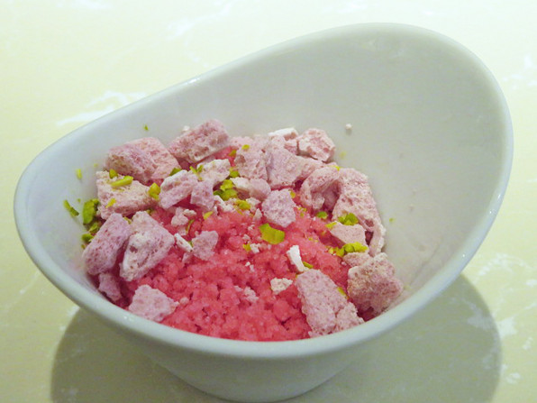 ●「おくだばらえん」奥田容彦さんのバラを使ったバラのグラニテ。目を瞠るほどの芳香のグラニテ、色も自然のものだそうで、驚異的なものだと思いました。